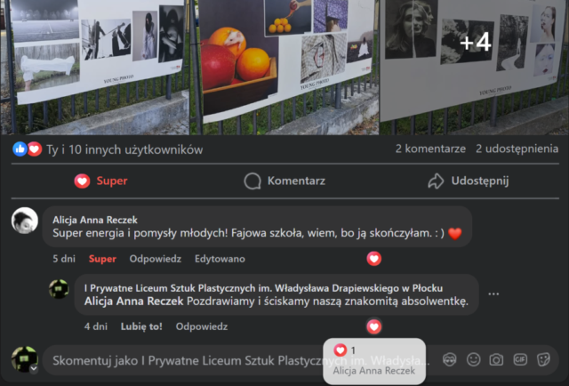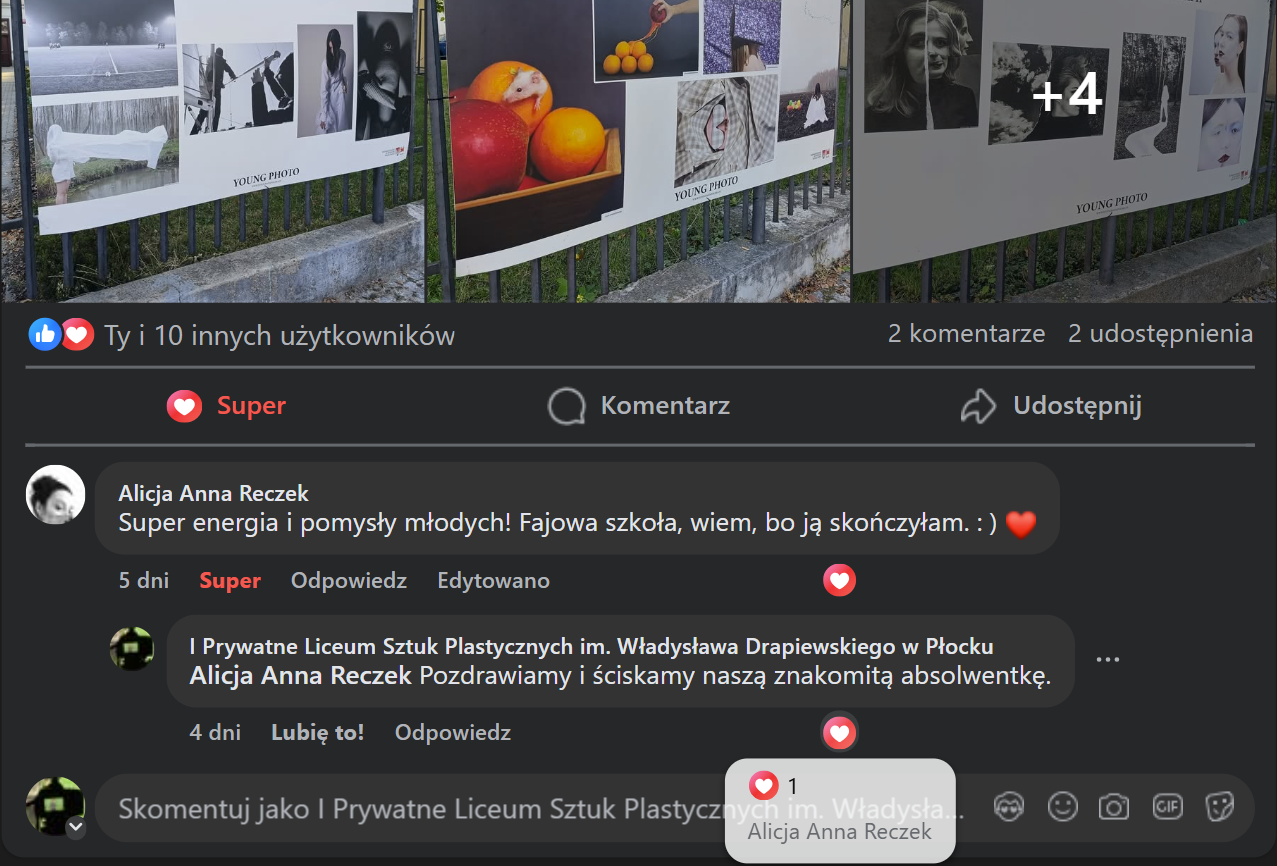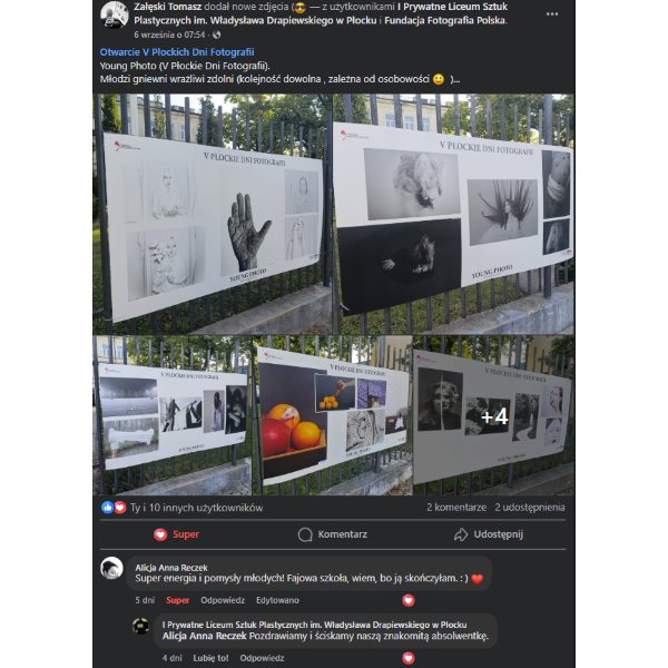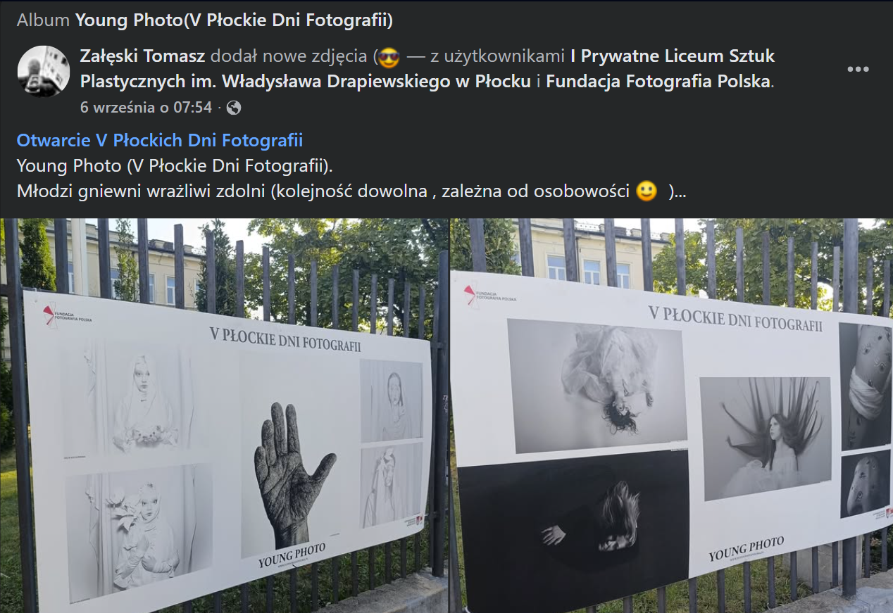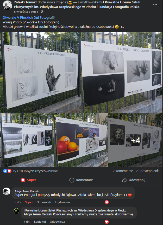 Wśród wypowiedzi fotografików nt. Young Photo zakończonych właśnie V Płockich Dni Fotografii mamy takie m.in. opinie: Tomasza Załęskiego – „Młodzi gniewni wrażliwi zdolni (kolejność dowolna, zależna od osobowości )…” i naszej absolwentki Alicji Anny Reczek – „Super energia i pomysły młodych! Fajowa szkoła, wiem, bo ją skończyłam. : ) ”.
