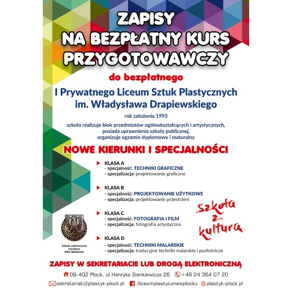 Zajęcia w specjalistycznych pracowniach prowadzić będą znani artyści, profesorowie I Prywatnego Liceum Sztuk Plastycznych im. Władysława Drapiewskiego (rok zał. 1993). Słynny płocki plastyk to szkoła bezpłatna z uprawnieniami publicznej, kończącej